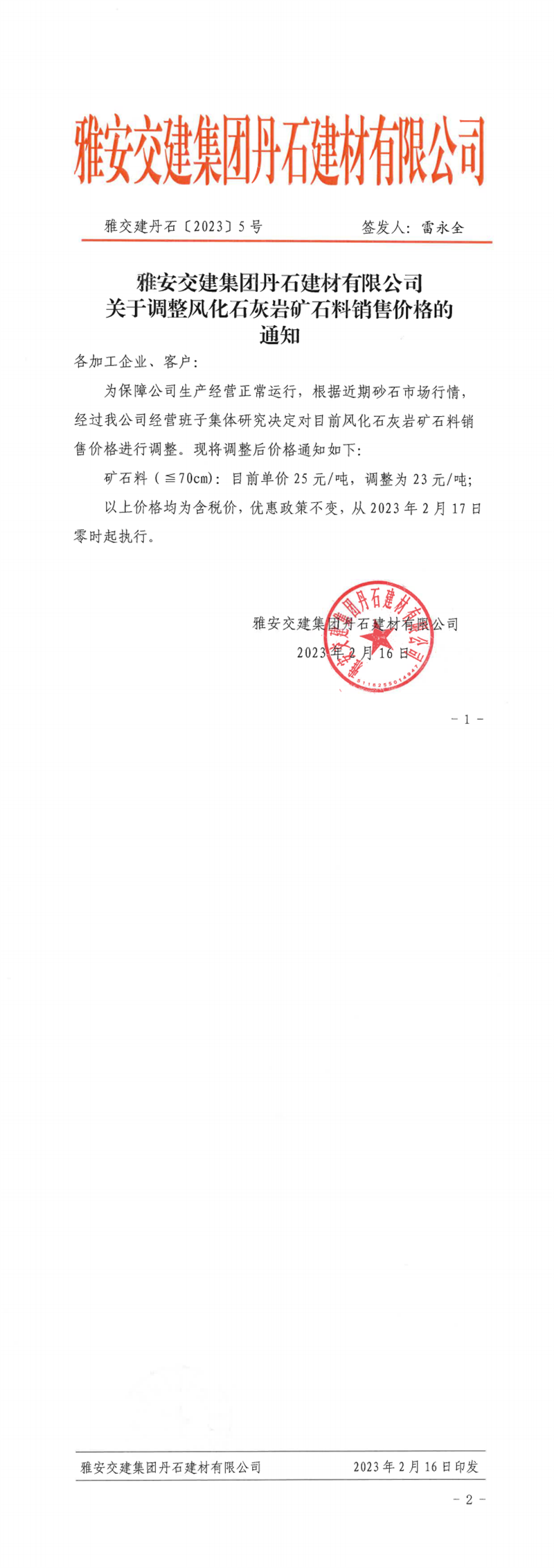 雅交建丹石(2023)5號調(diào)整風(fēng)化石灰?guī)r礦料銷售價格的通知(2023.02.16)