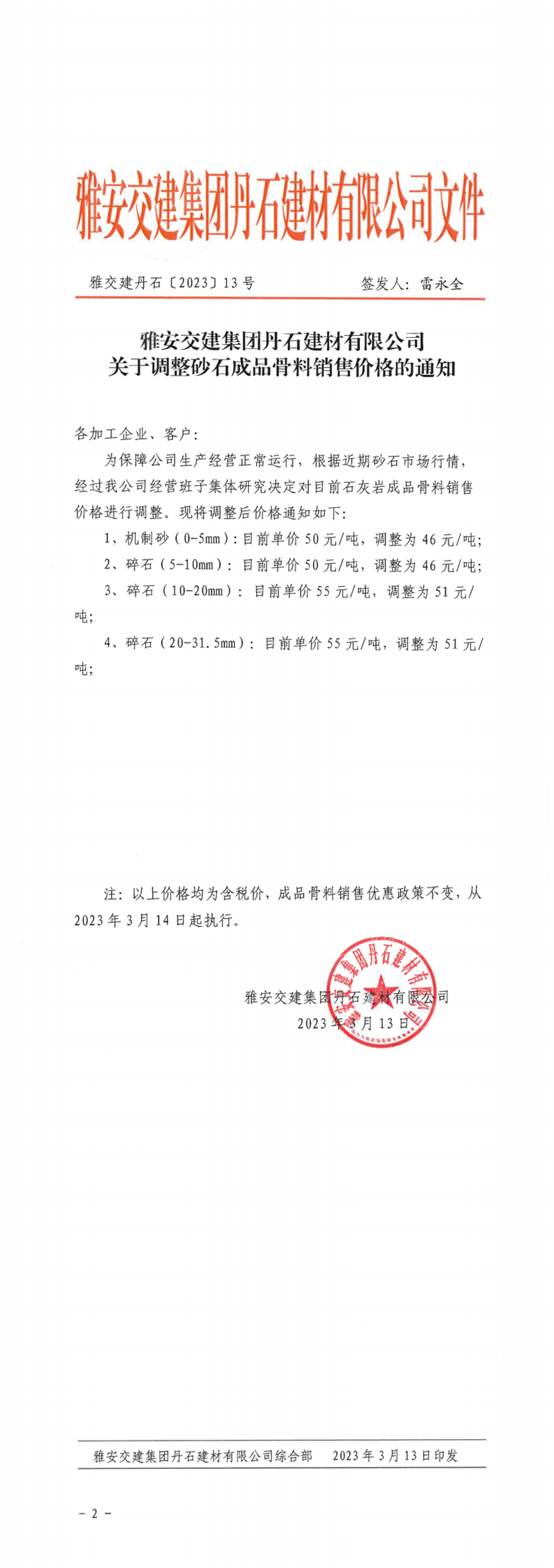 雅安交建集團興寶投資有限公司關(guān)于調(diào)整成品料價格的通知(2023.03.13)