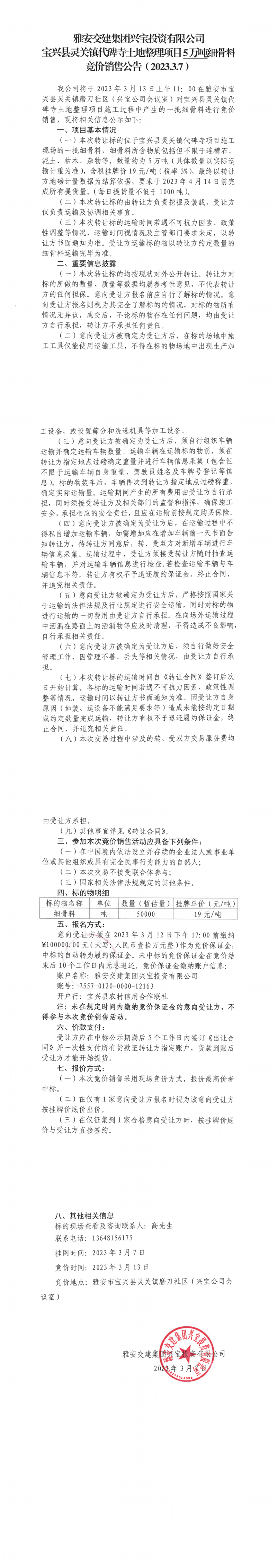 雅安交建集團(tuán)興寶投資有限公司寶興縣靈關(guān)鎮(zhèn)代碑寺土地整理項(xiàng)目5萬(wàn)噸細(xì)骨料競(jìng)價(jià)銷售公告(2023.3.7)