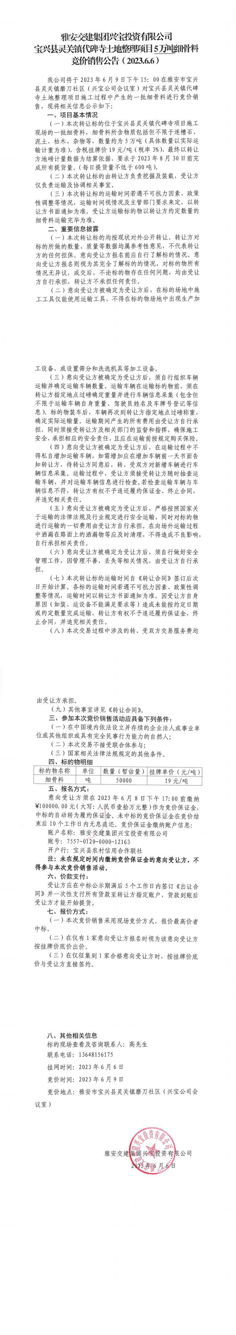 雅安交建集團(tuán)興寶投資有限公司寶興縣靈關(guān)鎮(zhèn)代碑寺土地整理項(xiàng)目5萬噸細(xì)骨料競(jìng)價(jià)銷售公告(2023.6.6)