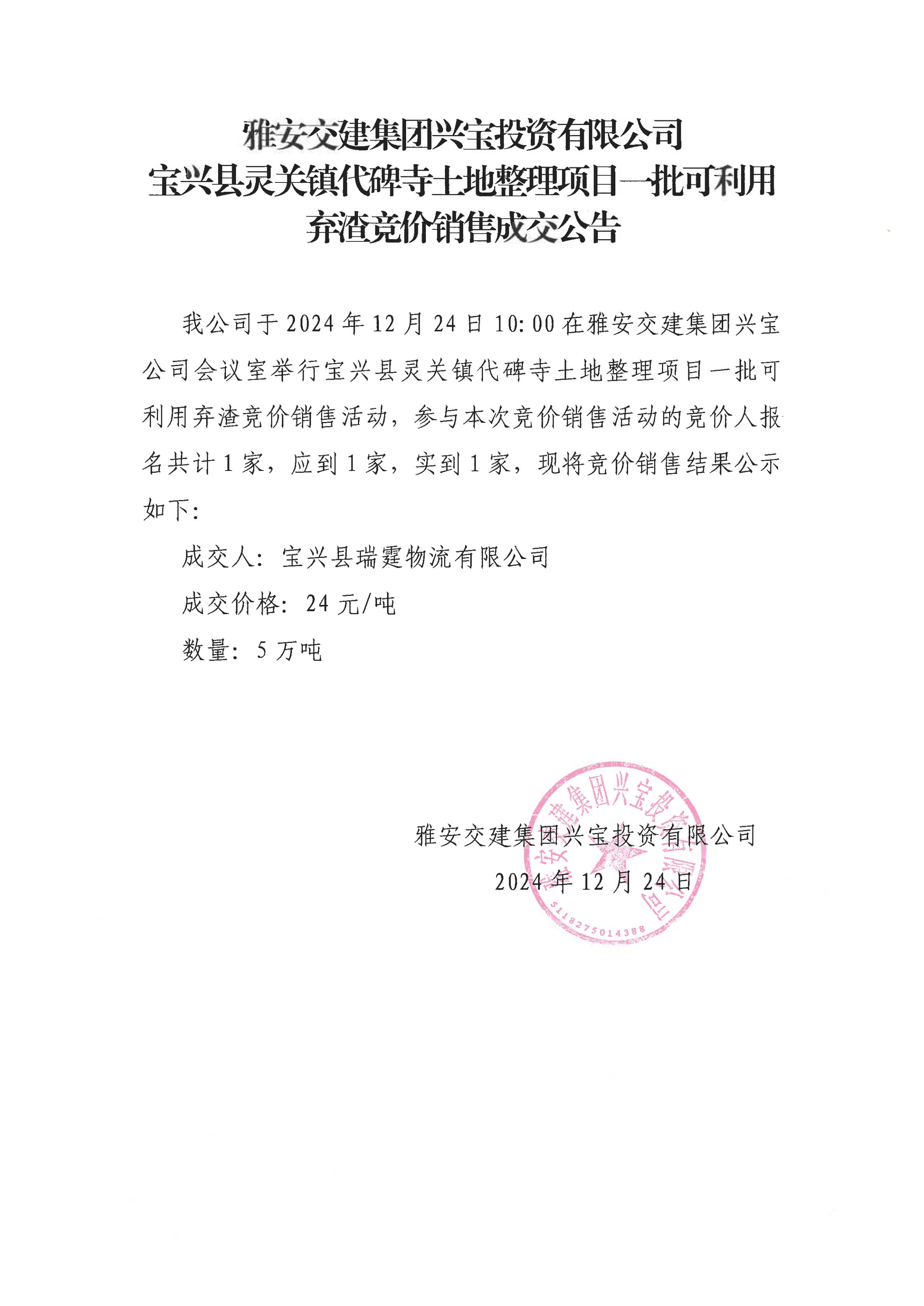 雅安交建集團興寶投資有限公司靈關(guān)鎮(zhèn)代碑寺土地整理項目5萬噸可利用棄渣成交公告(2024.12.24)