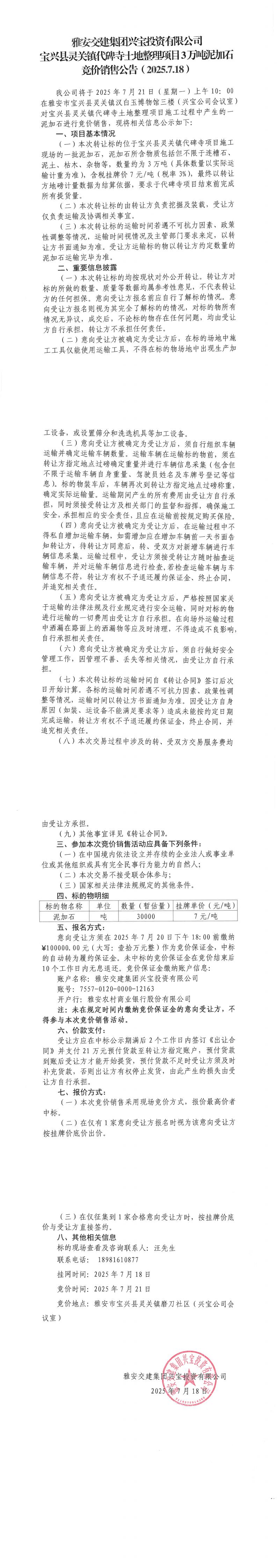 雅安交建集團興寶投資有限公司3萬噸泥加石競價銷售掛網(wǎng)公告